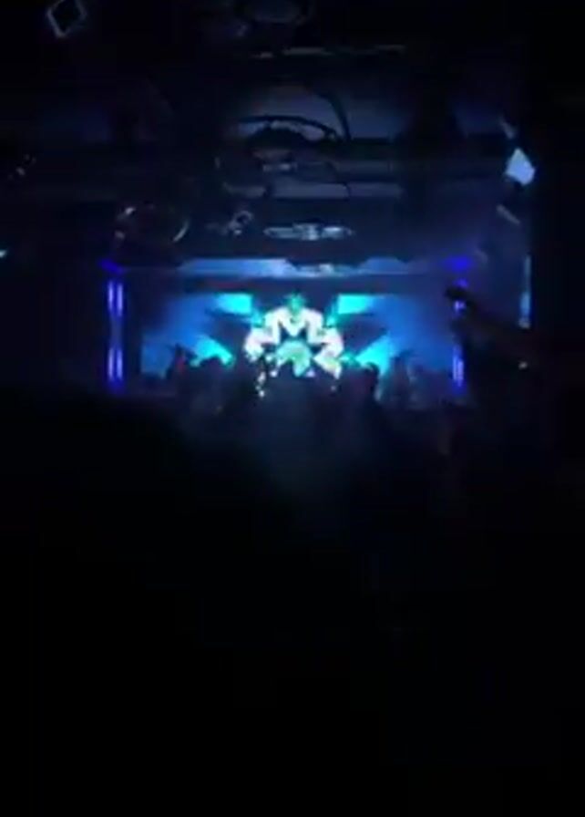 crowded dance floor in a nightclub or concert venue. A DJ is performing on stage, which is lit with bright white and blue lights and has a large screen displaying abstract graphics. The crowd is dense, with many people raising their hands in the air, seemingly enjoying the music. The lighting is dynamic, with various spotlights and stage lights illuminating the crowd. There are decorative lighting fixtures on the ceiling. The overall atmosphere appears lively and energetic.