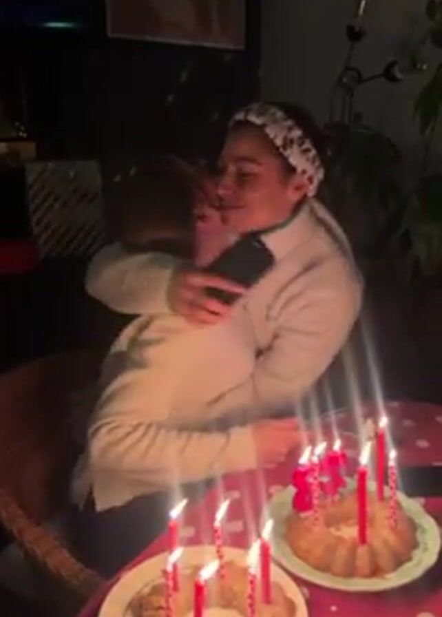 A video captures a birthday celebration scene. Two women are prominently featured in the shot. The woman who is seated wears glasses and has brown hair, and she is dressed in a white sweater. She is seated at a table laden with two cakes, each adorned with candles. The candles are lit, casting a warm glow on the scene. The other woman, who is standing, is also wearing a white sweater, along with a patterned headband. She is taller and has her arm around the seated woman's shoulder. In the beginning of the video, she embraces the seated woman by hugging her, kissing her on the forehead, and rubbing noses with her. They are both smiling and interacting, which suggests intimacy. The camera is handheld, resulting in slight movement. In the background, there is a painting hanging on the wall and a houseplant. The table features a red tablecloth with white polka dots.