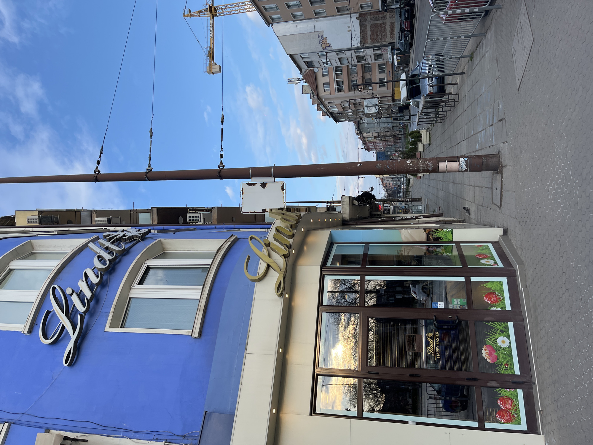The image displays an urban street scene in Sofia, Bulgaria, focusing on the exterior of a commercial building. The prominent subject is a "Lindt" chocolate store, occupying the ground and first floor of a curved building facade. The upper section of the building is painted royal blue with large, white, cursive "Lindt" lettering. The ground-floor storefront features large glass panels and brown-framed double doors, accented by gold "Lindt" signage above the entrance. The glass reflects a bright sky, bare trees, and a sunlit scene. Easter-themed decals adorn the lower sections of the glass, depicting red and pink LINDOR eggs, white daisies, and green grass, along with the text "LINDT HAPPY EASTER." To the right of the building, a grey paved sidewalk extends into the distance, bordered by a dark brown utility pole from which multiple overhead wires extend, secured by turnbuckles. A rusty white sign is attached to this pole. Further right, a metal barrier fence separates the sidewalk from a street with parked vehicles, including a silver sedan with a roof box. In the background, a street lined with multi-story residential and commercial buildings is visible, featuring varied architectural styles, balconies, and air conditioning units. A blurry sign for "APTEKA + PHARMACY" is discernible on one distant building. A single brown pigeon stands on the sidewalk near the utility pole. The sky above is blue with scattered white clouds, and a yellow Liebherr tower crane is visible on the horizon, indicating construction activity. No people are visible in the scene.