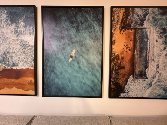 The scene in Petah Tikva, Israel, displays three framed aerial photographs mounted vertically on a light-colored wall above a partial view of a light grey upholstered sofa. The leftmost frame depicts an aerial view of a sandy coastline with white foamy waves breaking onto a warm, orange-brown beach. Two small human figures are visible on the sand near the water. The central frame presents an aerial perspective of a single individual on a light-colored surf or paddleboard, positioned in clear, calm, turquoise-blue ocean water. The rightmost frame shows an aerial view of a coastline featuring a rectangular ocean pool built into the shore, with significant white-capped waves crashing around and into the structure. The adjacent beach area is a warm orange-brown, and several small dark figures, consistent with human presence, are observable on this section of the shore. All three prints are enclosed in thin black frames.