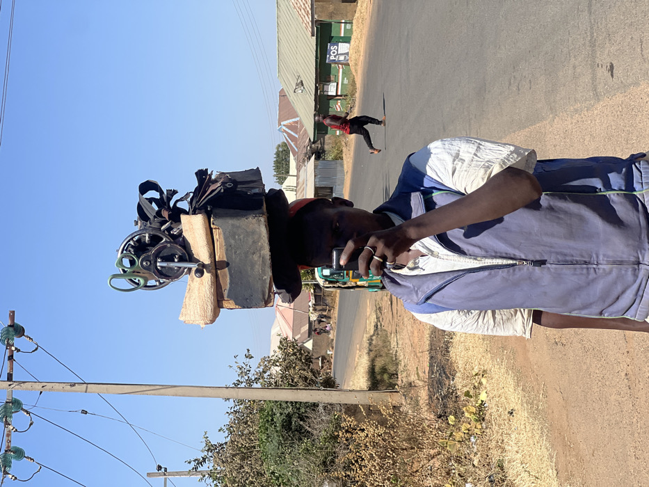 - "An outdoor, eye-level photograph captured in the city of Du, Nigeria, depicts a male subject in the foreground balancing a stack of items on his head while holding a smartphone" by FM-BltKA2, licensed under CC BY 4.0