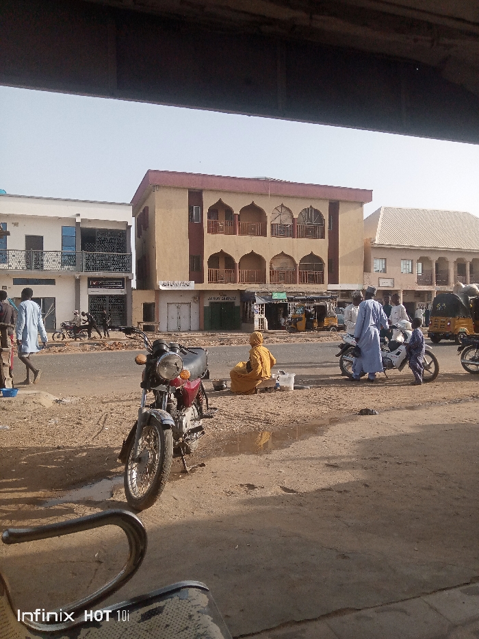 This image depicts a daytime street scene in Katsina, Katsina State, Nigeria, in the vicinity of Muhammadu Dikko Stadium