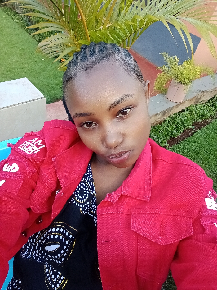 The image displays a medium close-up outdoor portrait of a young adult female. She has dark skin, dark eyes, and dark hair styled in tight braids pulled back from her forehead. She wears a distressed red denim jacket featuring white embroidered patches with visible text fragments such as "AM" and "RUG" on the wearer's left side. Underneath the jacket, a black garment with a white and gold abstract pattern is visible. The subject looks directly into the camera with a neutral expression. The background consists of a manicured green lawn. To the left, a light-colored rectangular block or platform is partially visible. In the upper background, large green palm-like foliage is prominent. To the right, a low stone wall supports a small, metallic-toned pot containing a light green, leafy plant. Behind this, a wall section exhibits geometric patterns in blue, black, red, and orange, with smaller green shrubs planted along its base. The scene is illuminated by natural daylight. This scene is located in Nyeri, Kenya.