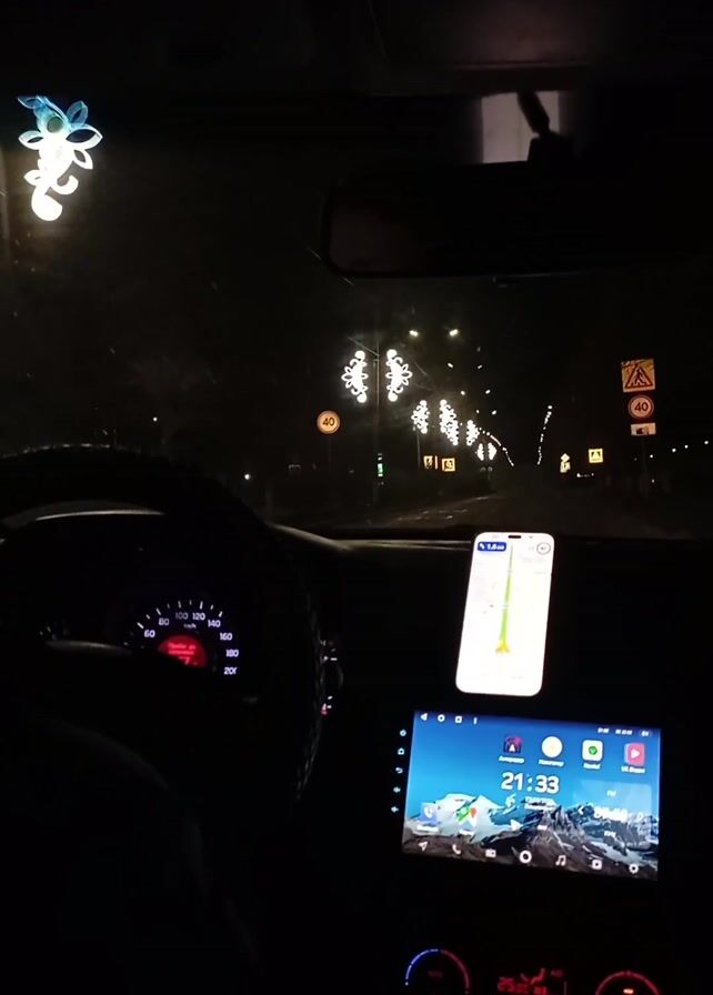The video depicts a view from the driver's seat of a car at night. The dashboard is visible, displaying a speedometer reading around 102 km/h, a smartphone mounted on the dashboard showing a navigation app, and a built-in entertainment system displaying the time as 21:33. The steering wheel is in the foreground. The road ahead is illuminated by streetlights adorned with decorative snowflake-like patterns. Traffic signs are visible along the roadside. A voice can be heard saying "fotkay, fotkay."