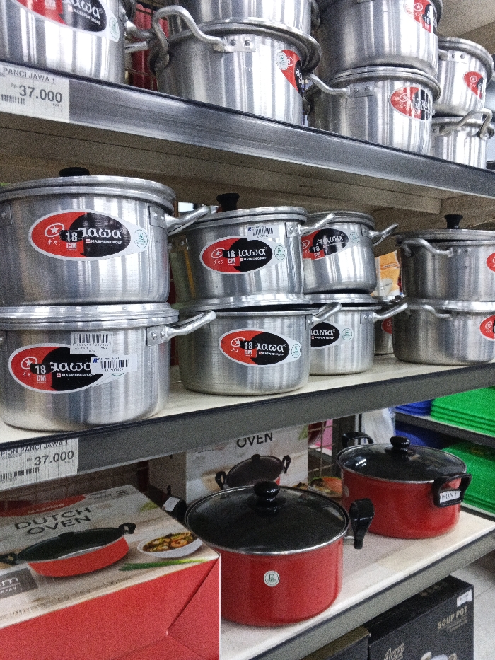 The image displays a variety of cookware on shelves. The top two shelves hold stacks of aluminum pots with handles and lids. Each pot features a red and black "18 Jawa CM Mashion Group" label. Price tags reading "PANCI JAWA J" and "37.000" are visible. The bottom shelf showcases red and black Dutch ovens and soup pots, along with boxes labeled "OVEN" and "SOUP POT." Green plastic trays are also present on the shelves.