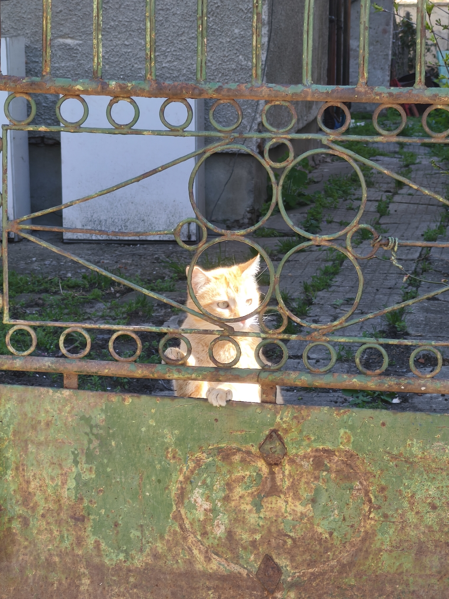 A medium shot captures a light orange cat behind a weathered, green, wrought-iron gate. The gate features circular patterns and is showing signs of rust and peeling paint. The cat is positioned in the center of the frame, peering through the gate's design. Behind the gate, there's a concrete pathway with sporadic green plants growing between the slabs. In the background, the corner of a white building and part of a gray structure are visible. The location is Sofia, Bulgaria.