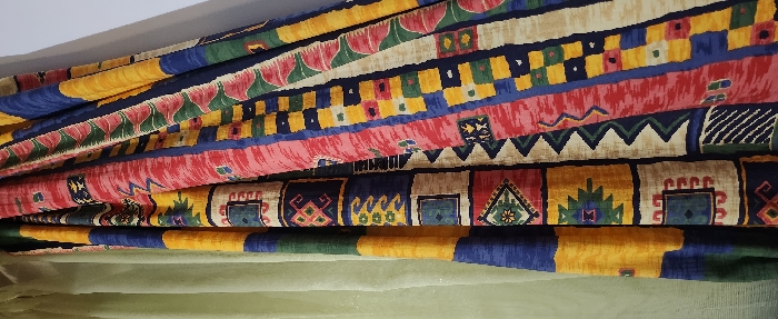- "The image displays a close-up, vertical view of multiple patterned and folded curtains, likely situated indoors in the city of Blagoevgrad, Bulgaria" by FM-cNrdi2, licensed under CC BY 4.0