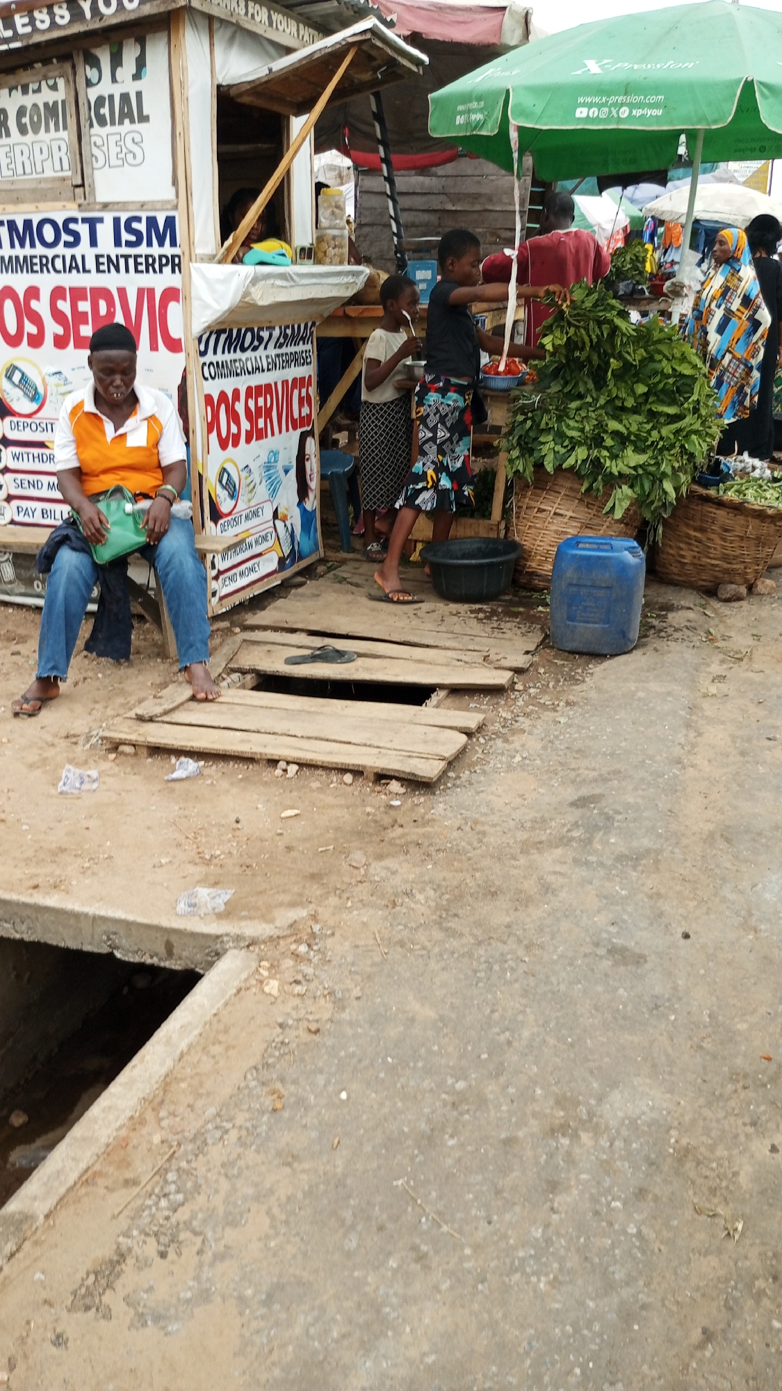 The image depicts a street scene in Zango-ndaji, Nigeria. A small commercial booth labeled "UTMOST ISM COMMERCIAL ENTERPRISES POS SERVICES" is visible. A man in an orange shirt and blue jeans sits on the edge of the booth, with bare feet dangling over a covered drainage ditch. The wooden planks covering the ditch are partially broken. Two children stand in front of the booth, one eating from a bowl. A vendor stands under a green umbrella, selling leafy vegetables from a basket. A blue jerrycan sits nearby. Several other people are visible in the background. The ground is dirt and concrete, with visible debris. A concrete drainage canal is in the foreground.