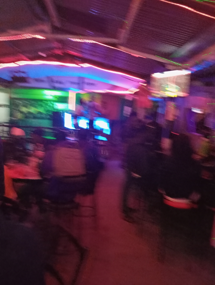 The image appears to be taken inside a bar or club. The scene is blurry, suggesting movement during the photo. There are people sitting at tables. There is colorful lighting in the ceiling, including red, blue and green hues. A television is present. The overall atmosphere seems lively and dimly lit.
