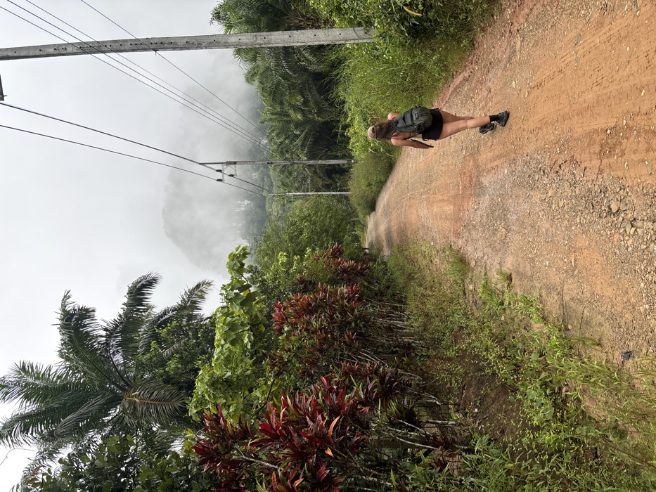 A female individual is observed walking away from the viewer on a reddish-brown gravel and dirt road in Khlong Sok, Thailand