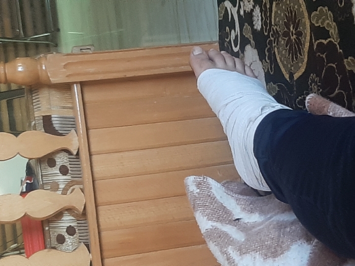 The image displays a human lower left leg and foot, resting indoors. The foot and ankle are wrapped in a white medical bandage, with the toes visible at the distal end. The leg is partially covered by dark pants. This appendage rests on a dark-patterned fabric surface, featuring gold and white floral or abstract designs, likely a cushion or mattress. To the immediate left of the leg, a textured object, possibly a pillow or blanket, exhibits a white and brown pattern. In the background, a wooden furniture piece, possibly a headboard or divan frame, consists of vertical wooden planks and decorative, turned baluster-style elements. Behind this, a woven element with dark circular details is visible. The environmental specifics do not provide visual cues to confirm the location as Barza Municipality, Syria.