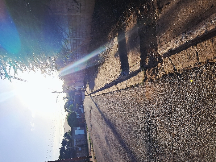 A street scene with a strong sunlight flare. A building stands on the left, with what appear to be power lines stretching into the sky. A road with a central stripe cuts through the scene, lined by sidewalks and a shadow. The street has some visible pebbles or gravel. Trees and other buildings are visible in the distance. The view is tilted, giving a slightly disorienting perspective.