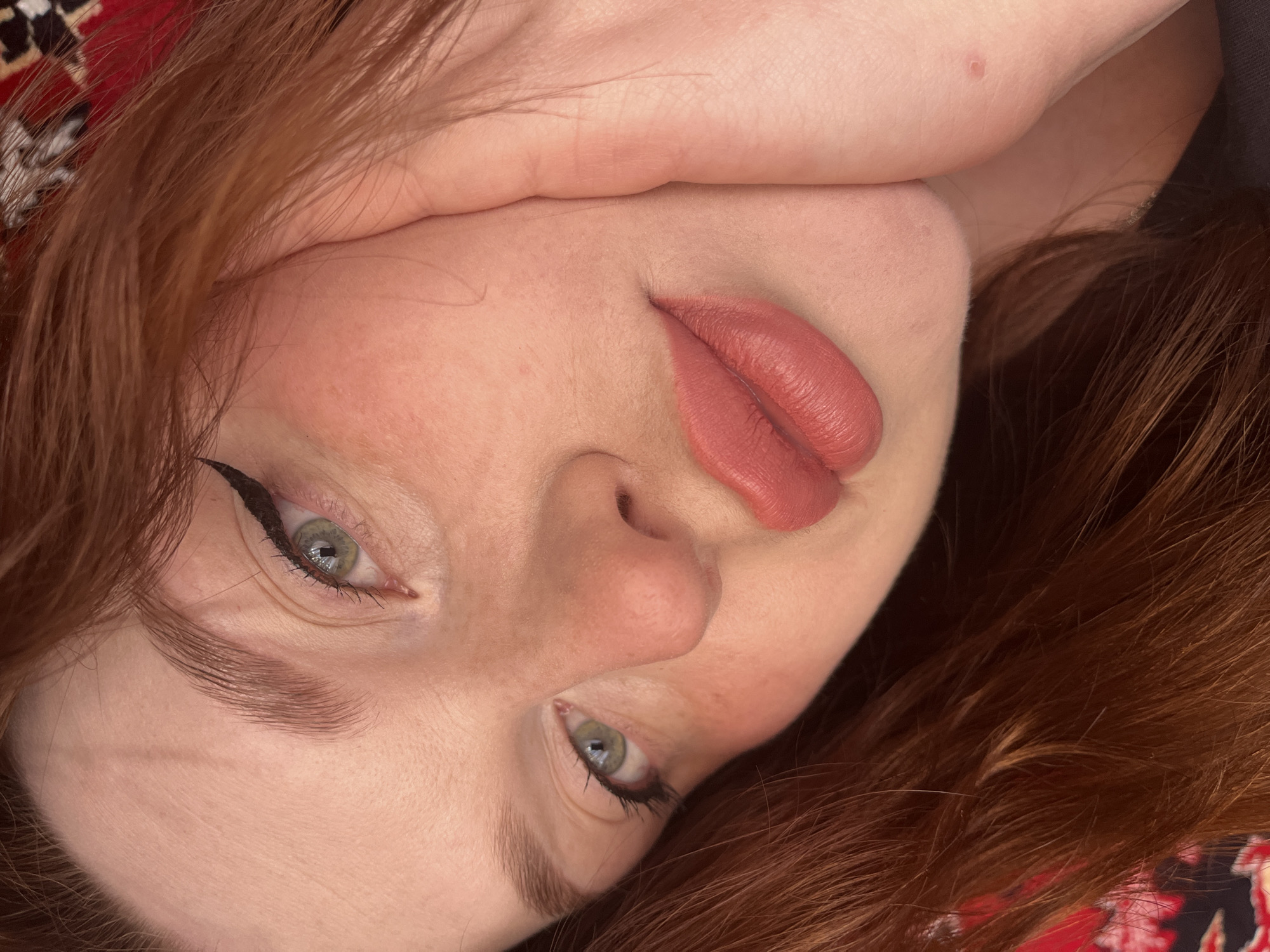 A close-up portrait shows a woman with reddish-brown hair and fair skin, tilted to her left