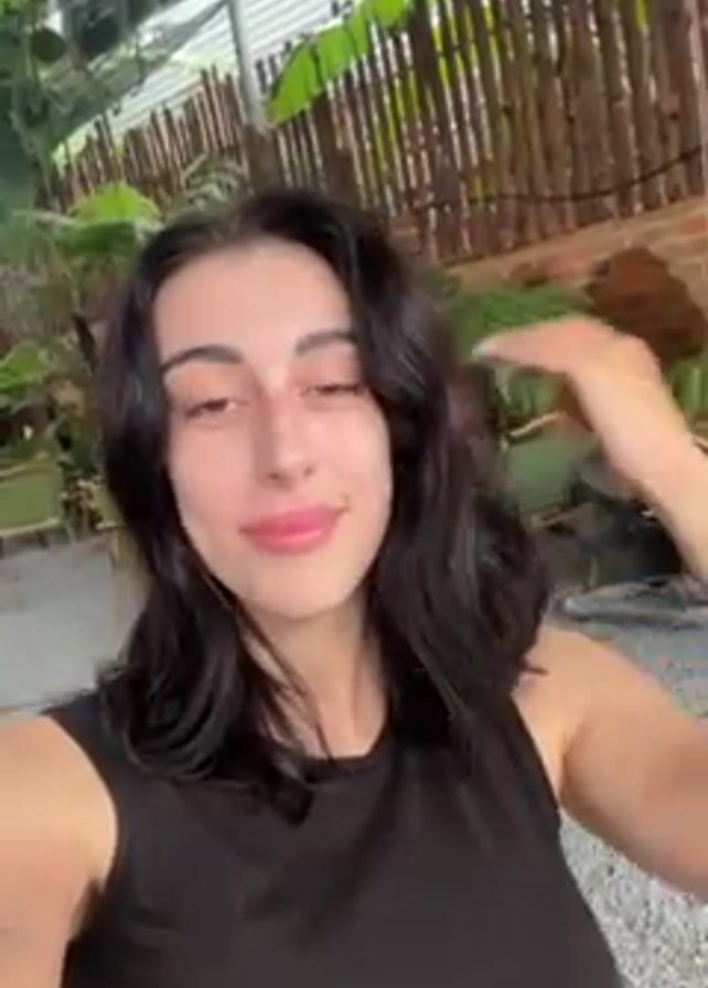 A woman with dark hair, wearing a black tank top, is seen in a selfie-style video