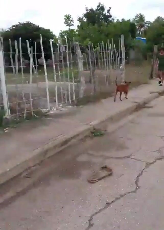 person walking on a sidewalk, followed by a small brown dog. The person, who appears to be a young woman wearing a green dress and dark sneakers, walks past the dog, who appears to be barking. The video then transitions to a shot of the empty sidewalk and continues with footage from the perspective of someone riding a bicycle on a cracked asphalt street. The surrounding area features a simple fence, scattered greenery, and a few houses in the background. The sky is overcast.