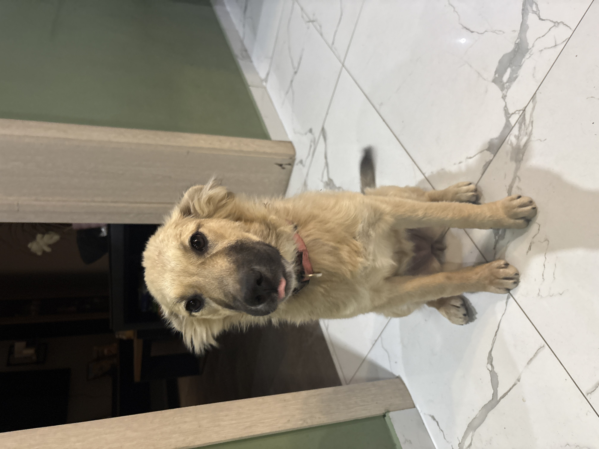 A medium-sized, light-brown dog sits on a white marble floor. The dog has a pink collar and is looking up towards the camera, with its tongue slightly sticking out. The background includes a green wall and a partially visible dark object, possibly a piece of furniture. The location is unspecified and cannot be determined from the image. There is no explicit evidence indicating the photo was taken in Shivachevo, Bulgaria.