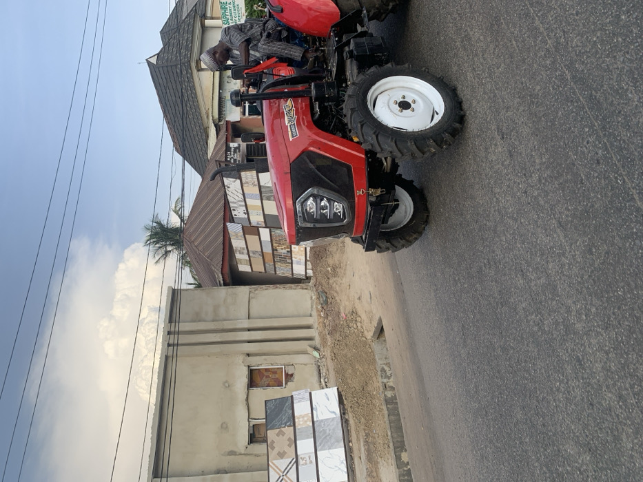A red tractor sits on an asphalt road, its white-rimmed tires visible. An individual wearing a striped shirt and a white cap is seated on the tractor. Behind the tractor, a building with a tiled exterior is partially visible. In front of the building and the tractor, ceramic tiles are stacked on the ground. Overhead, a sky with grey-tinged clouds is present.