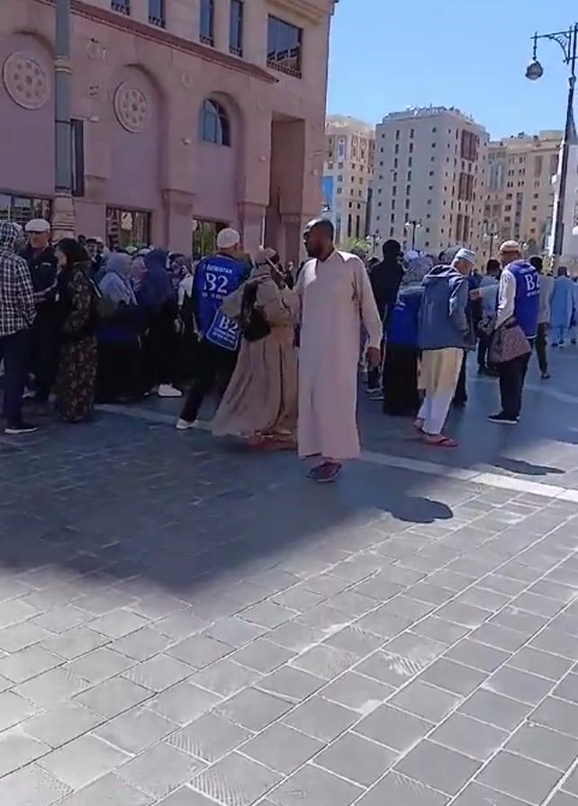 A group of people, likely pilgrims, is walking in a city square on a sunny day. Many of them are wearing blue vests with "B2" printed on them. The people are diverse in age and clothing styles, including traditional robes and casual wear. They seem to be moving as a group, possibly guided by someone. The square is paved with grey stones, and tall buildings surround it. The architecture is modern with some traditional elements. The overall impression is of a organized group of pilgrims exploring a city.