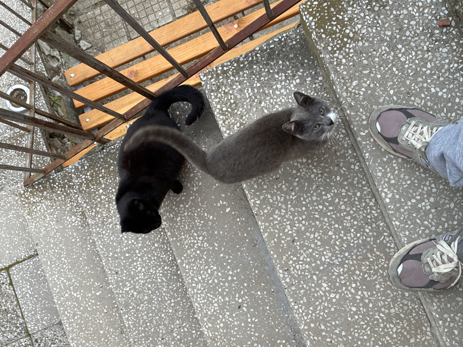 An overhead view captures a scene on an outdoor concrete staircase in Pastrogor, Bulgaria. The lower extremities of an individual wearing grey sweatpants and light grey/brown athletic shoes with white laces are visible in the foreground, positioned on a step. Below the individual, two domestic cats are present on the stairs. A dark grey cat with a white muzzle and chest, and prominent green eyes, is positioned on the step immediately below the individual's feet, looking directly upward towards the camera. Its tail is erect and curves towards the upper steps. Approximately two to three steps higher and to the right, a solid black cat is positioned, facing away from the camera and towards the right side of the frame, with its tail curled. The stairs are constructed of speckled aggregate concrete, exhibiting minor wear. To the right of the stairs, a section of a dark, possibly rusted, metal railing is visible, with a structure composed of horizontal wooden planks situated further down and to the right, beneath the railing. Natural light illuminates the scene.