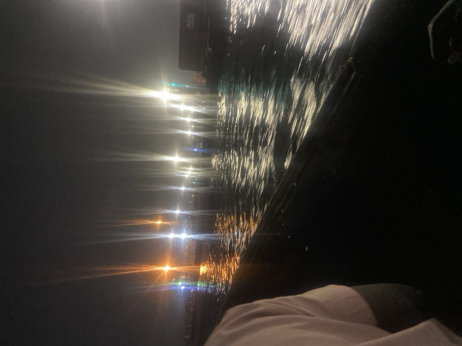The photograph depicts a nighttime scene along a waterfront. A series of lights, possibly streetlights or dock lights, stretch into the distance, their reflections shimmering in the water. The water's surface is dark and rippled, reflecting the lights with elongated streaks. A dark structure, perhaps a building or dock, is visible in the background. In the foreground, blurred and out of focus, are parts of a person's clothing. The overall impression is a somewhat blurry and atmospheric night view.