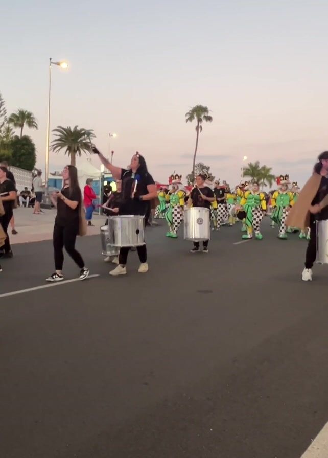 parade moving down a street at twilight. A group of people dressed in black shirts and pants, and wearing drums, are walking and playing the drums. In front of them are people dressed in green and black costumes with tall, elaborately decorated hats. Some palm trees are visible, as well as other people watching the parade. The sky is pale blue.