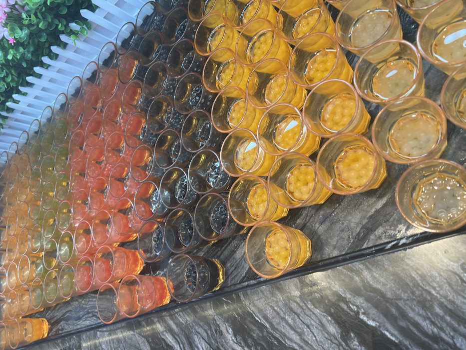 The image displays a large quantity of small, uniform beverage glasses arranged in diagonal rows on a dark, mottled countertop, likely within a commercial or event space in Mondeville, France. The glasses, predominantly transparent or lightly tinted, contain a variety of liquids and toppings. In the upper section of the arrangement, rows of glasses hold an orange liquid, transitioning to a greenish liquid, then a reddish-pink liquid. Below these, several rows contain a dark, clear liquid. The foreground rows feature glasses filled with a light yellow liquid containing numerous small, spherical, yellow objects. Other glasses in the foreground contain a clear liquid with similar small, spherical, clear objects. The countertop exhibits a veined pattern, resembling granite or marble. In the upper right background, a decorative white picket fence is visible, positioned in front of artificial green foliage and pink flowers. No individuals are present in the scene, and no actions or interactions are depicted; the arrangement is static.