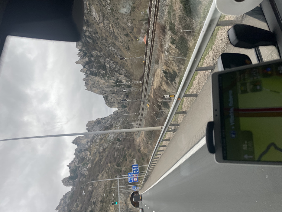 - "The image presents a forward view from inside a vehicle, likely a bus or truck, traveling on a wet multi-lane highway through a mountainous gorge in Pancorbo, Spain, under an overcast sky" by FM-aSc183, licensed under CC BY 4.0