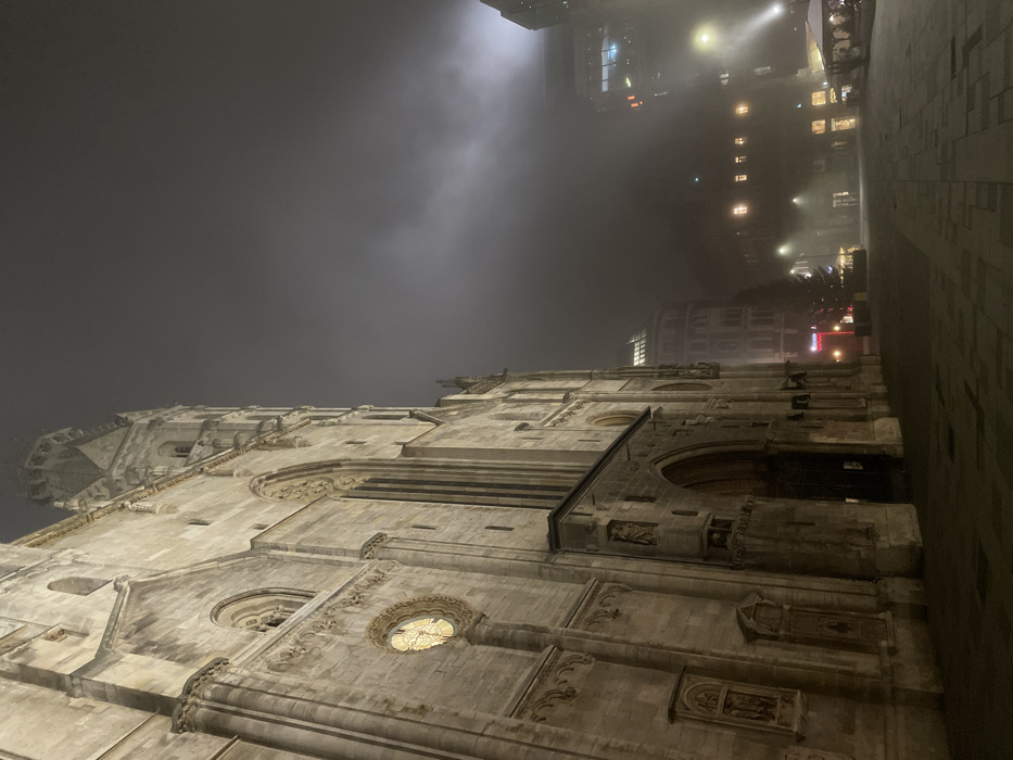 A monumental stone building dominates the foreground, its architectural details richly carved and illuminated. Above, a dark, overcast sky contrasts with the faint illumination of distant buildings. A paved area borders the building on the right. The image is rotated counter-clockwise. Fog obscures details in the distance, creating an atmospheric, almost ethereal scene.