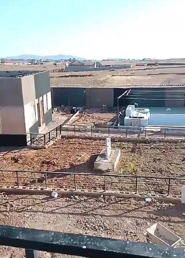 n outdoor construction site from an elevated perspective, likely a balcony. The focus is on a rectangular swimming pool, partially filled with water, situated within a fenced-off area. Adjacent to the pool is a small, modern building under construction, with visible concrete and unfinished walls. The surrounding ground is mostly bare dirt, with some areas enclosed by black metal fencing, possibly indicating planned garden plots. Discarded tires and construction materials, including a wheelbarrow, are scattered around. In the background, a flat landscape extends to the horizon, showing similar construction projects or vacant lots under development. The sky is clear and bright, suggesting a sunny day. The camera remains stationary, providing a wide shot of the scene without any noticeable movement or manipulation.