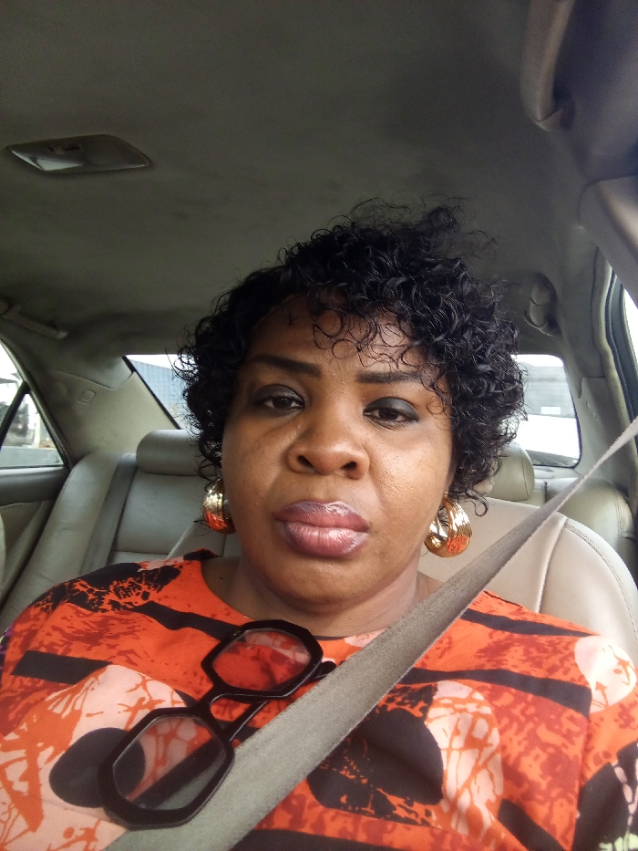 A woman sits in a car, wearing a patterned orange and black top, secured by a seatbelt. Black-rimmed glasses rest on her chest, and she sports large, gold hoop earrings. Her hair is short, dark, and curly. The car interior is light-colored, with the back seats visible. The woman gazes directly at the camera with a neutral expression. A window is seen behind her.