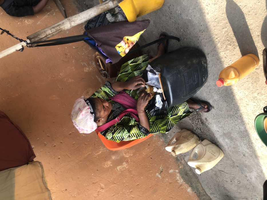 This image captures a street-level scene in Aiyetoto-Asogun, Nigeria, featuring a woman engaged in preparation activities