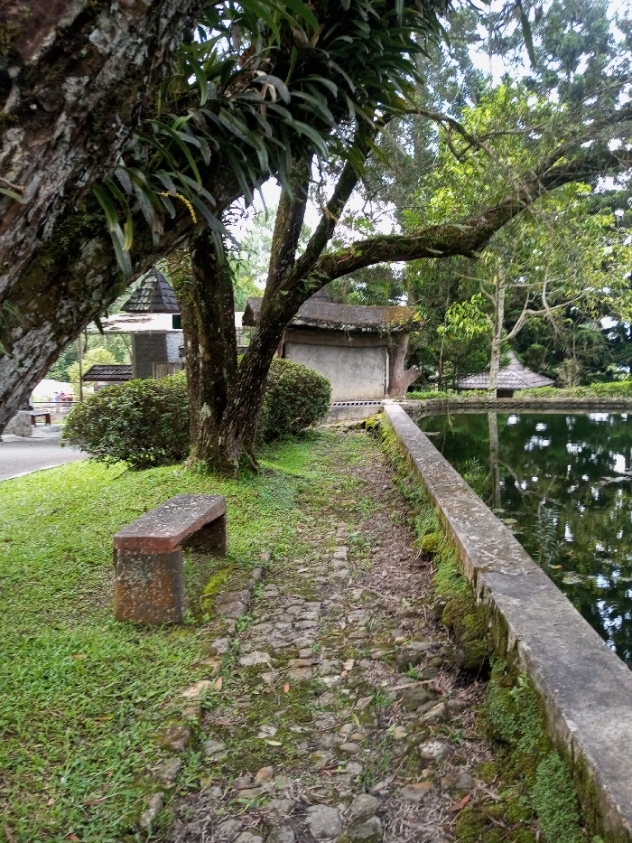 The image displays an outdoor park or garden scene in Ambositra, Madagascar, under an overcast sky. A large tree trunk, partially cropped on the far left, is heavily textured with bark and exhibits growths of moss and epiphytic plants. To its right, a rustic, weathered stone bench, appearing reddish-brown with areas of moss and lichen, is situated on closely cropped green grass. An irregular, moss-covered cobbled pathway extends from the bottom center towards the midground. On the right side, a dark, reflective body of water is present, bordered by a low, horizontal concrete wall that is extensively covered in green moss and algae. In the midground, multiple trees with dark, moss-laden trunks and green foliage are scattered. A significant tree in the center features thick branches arching towards the right. Behind the bench and central trees, rounded green bushes are evident. Two small buildings are visible: one on the left, partially obscured by foliage, features light-colored walls and a dark, multi-tiered roof. Another structure on the right, bordering the water, has light-colored walls, a dark sloped roof, and a concrete base with visible drainage elements. Further into the background, the dark, conical roof of an additional pavilion is discernible amidst dense green trees and foliage. No individuals are present within the frame.
