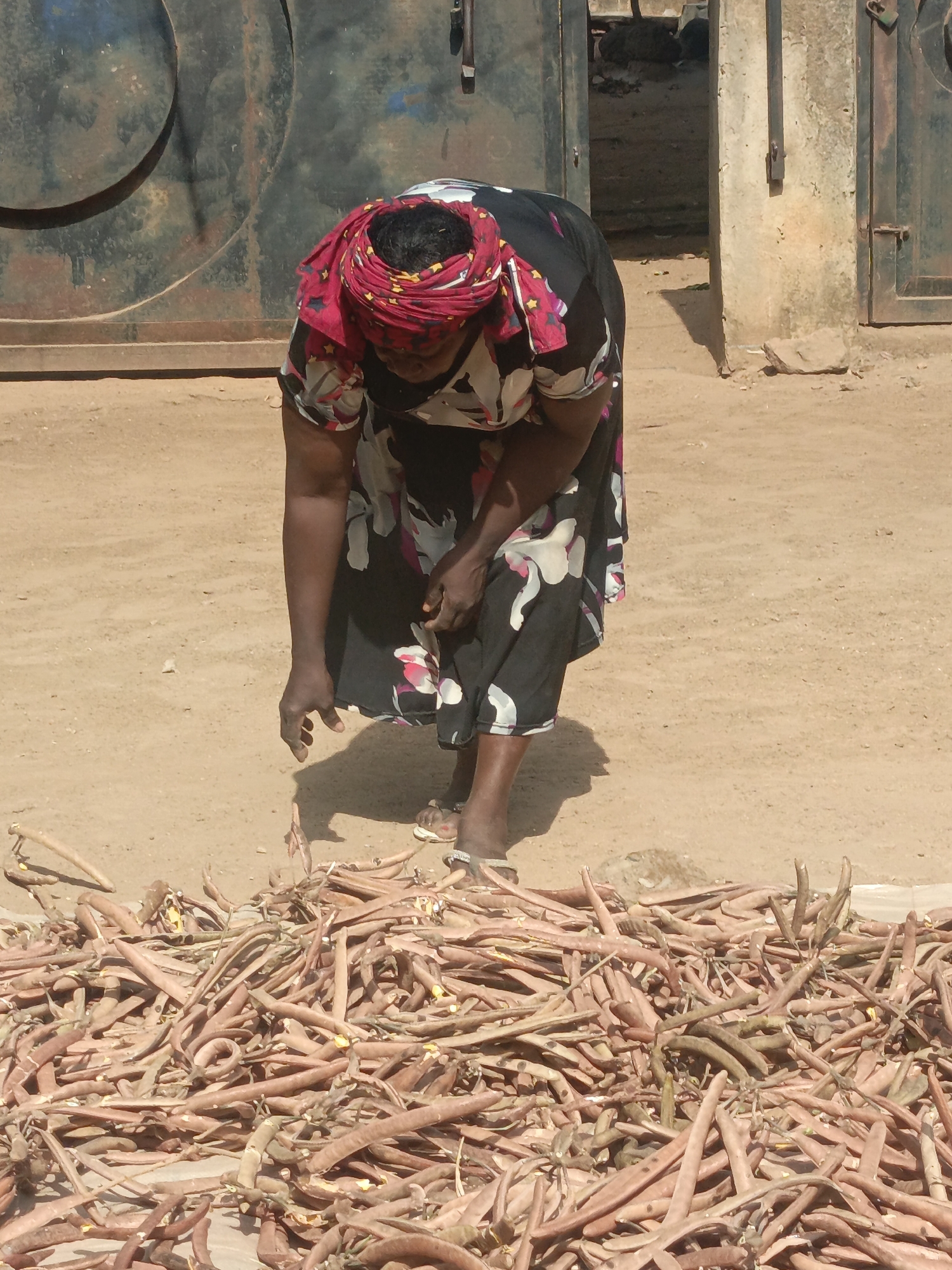 In Akwanga, Nigeria, an African woman wearing a floral print dress and a red patterned headscarf is bent over a large pile of dried seed pods on a sandy ground. She is reaching out with her right hand towards the pods. Behind her are two metal doors. One door is circular, while the other is rectangular. The setting is outdoors in daylight.