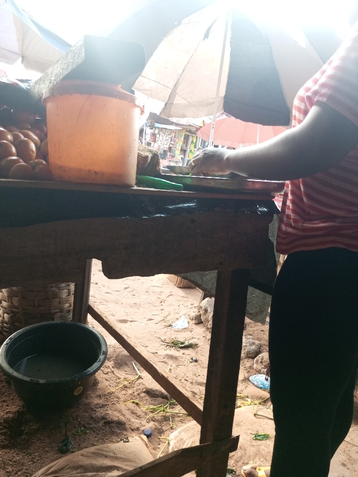 The scene depicts an outdoor market stall in Unknown, Unknown