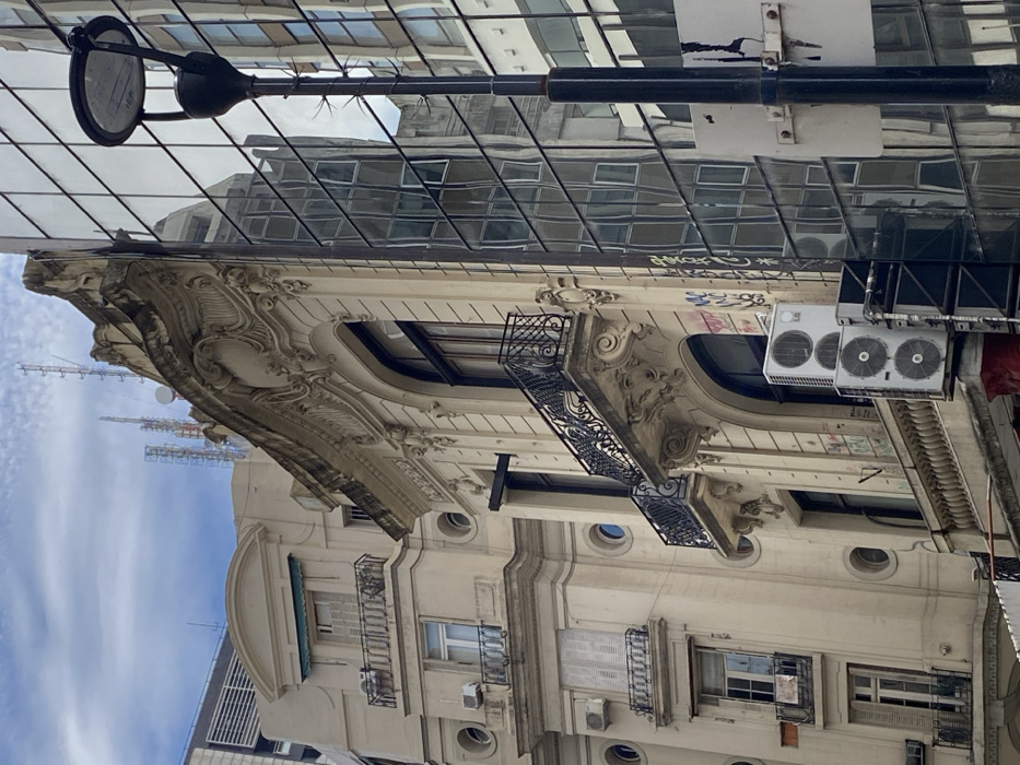 An ornate building with classical architectural details, including curved balconies and decorative molding, stands juxtaposed with a modern glass structure reflecting the building's image. A street lamp partially obscures the view. Air conditioning units are mounted on the side of the classical building. The sky is visible behind the building on the left side. The orientation is slightly tilted. Graffiti adorns the classical building.