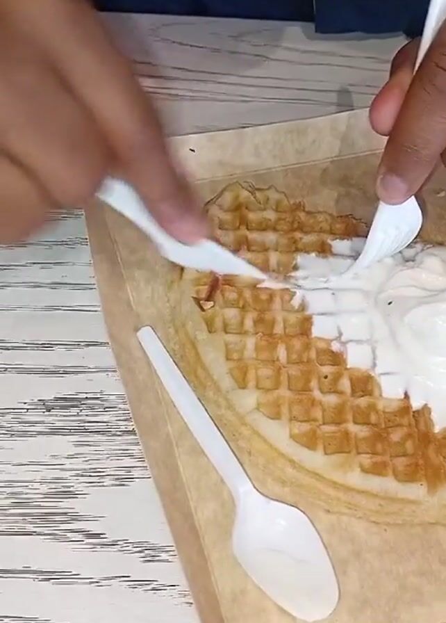 - "A person is spreading white cream on a waffle with a plastic fork and knife" by FM-FCCQg2, licensed under CC BY 4.0