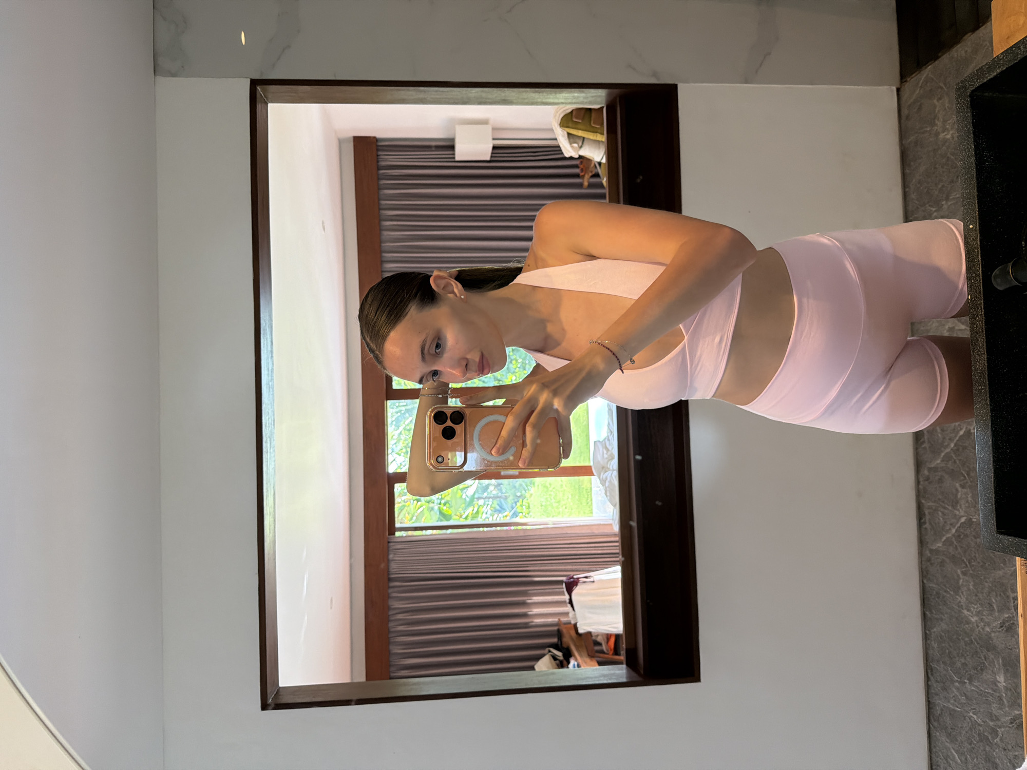 A fair-skinned young woman with dark hair is reflected in a mirror in an indoor setting. She is wearing a light pink exercise outfit with a sports bra top and short bottoms. She is holding a gold-colored phone with a transparent case, angled as if taking a selfie in the mirror. The reflection reveals a room with window blinds behind her. Outside, green foliage is visible through the window. The mirror has a dark brown frame and is placed against a wall that is light-colored. To the right of the mirror, a dark marble surface suggests a bathroom vanity area. The setting is located in Petulu, Indonesia, based on contextual details implied by the surroundings.