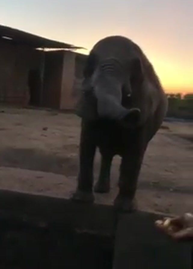 n elephant standing on a concrete ledge in what appears to be a zoo or sanctuary, with a person offering food in a bag. The elephant extends its trunk toward the bag, seemingly interested in receiving the food. The background shows a simple building and trees against the colors of a sunset.