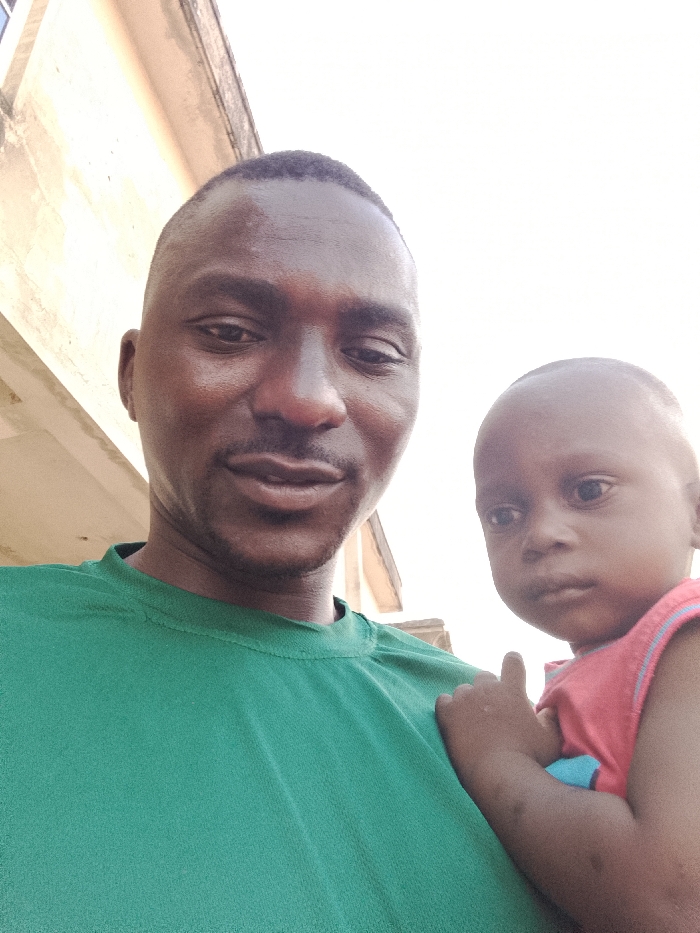 The scene captures an adult male holding a young child outdoors in Nassarawa Egon, Nigeria
