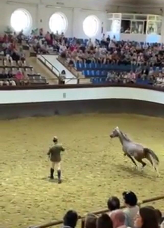 light-colored horse being guided in circles in a large indoor arena by a man with a whip. The horse is trotting around the ring, while the man is following along, gently directing the animal with his whip. The arena is surrounded by tiered seating filled with an audience watching the performance. The floor of the arena is covered in a tan material, and there are windows providing light. A spectator view is also shown where viewers are watching the show from behind a waist-high wooden barrier.