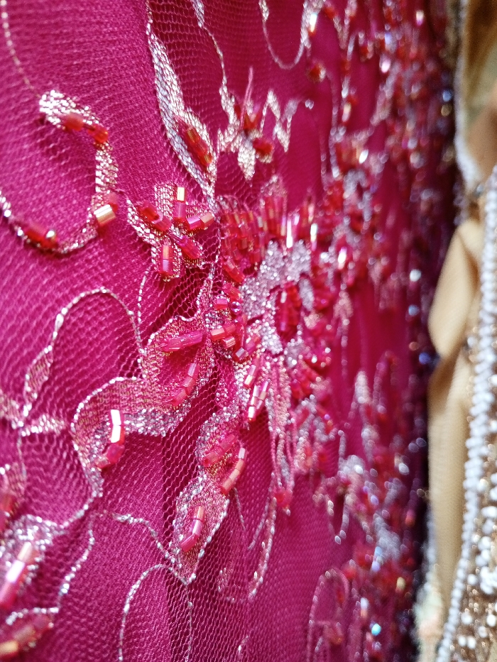 A close-up shows ornate fabric. The base is a bright pink mesh, overlaid with silver embroidery outlining floral or leaf-like shapes. Each shape is adorned with red beads in varying sizes and shapes, including cylindrical and cubed. The beads add depth and texture. In the background, a section of gold fabric with pearl-like embellishments is visible, suggesting the presence of a second garment. The overall impression is of elaborate and luxurious design.