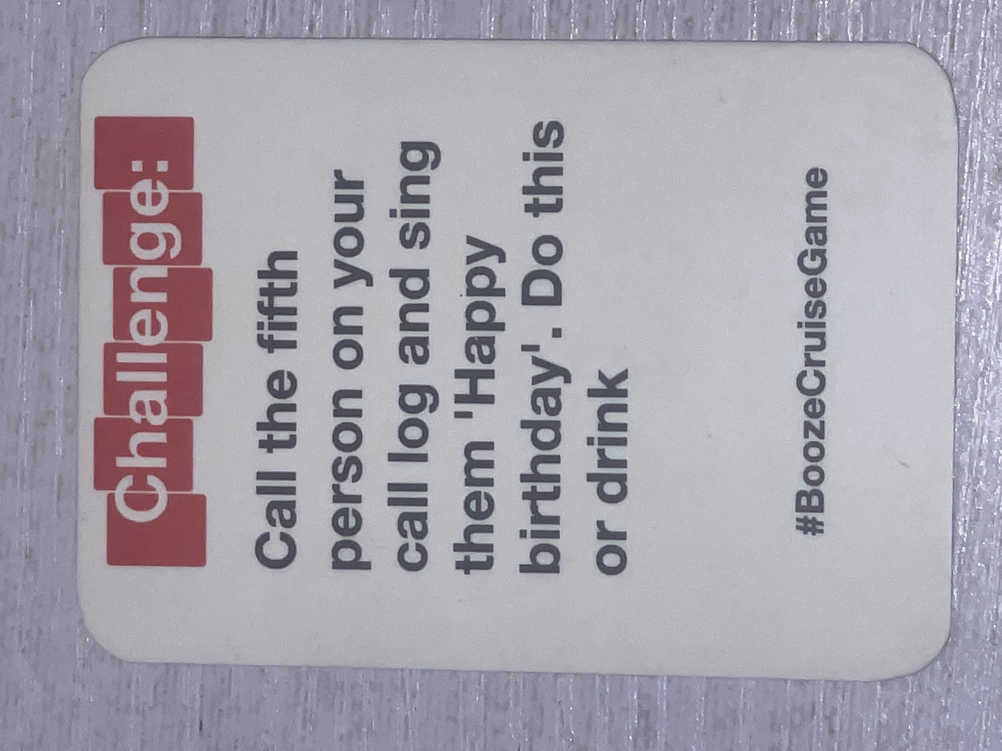 game card with a challenge written on it. The card is light beige with rounded corners and has the word "Challenge:" in red with a decorative border made up of red squares. Below it, the text reads "Call the fifth person on your call log and sing them 'Happy birthday'. Do this or drink". On the right side, the hashtag "#BoozeCruiseGame" is printed. The card is placed on a textured, light gray surface. There is no information in the image about the city of Abraka, Nigeria.