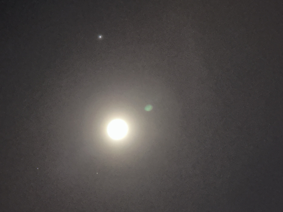 The scene depicts a dark night sky, as observed from Hrodna, Belarus. A prominent, intensely bright, circular celestial body, identified as the Moon, is positioned in the upper-central left portion of the frame, emitting a strong glow. To the upper right of the Moon, a distinct, bright, point-source light, consistent with a planet or prominent star, is visible. Multiple fainter, minute light points, indicative of distant stars, are sparsely scattered across the dark firmament. A greenish lens flare artifact is present directly below the Moon, originating from the intense light source. The environment is exclusively celestial; no terrestrial features, structures, individuals, or activities are visible within the image frame.