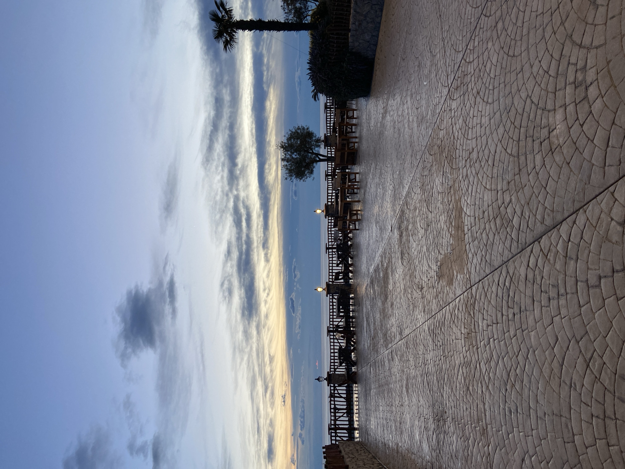 The image depicts a partially cloudy sky above the Adriatic Sea, with a view from what appears to be an outdoor patio or promenade in or near Kovačko Polje, Montenegro. The patterned pavement occupies a large portion of the right side of the image. A wrought iron railing lines the edge of the walkway, with tables and chairs set up for outdoor dining. Small trees, including a palm, are visible along the railing. Light posts are spaced along the walkway. In the distance, the sea meets the sky, and the partially cloudy sky contains striated clouds with colors suggesting sunset or sunrise. There are no people visible in the frame.