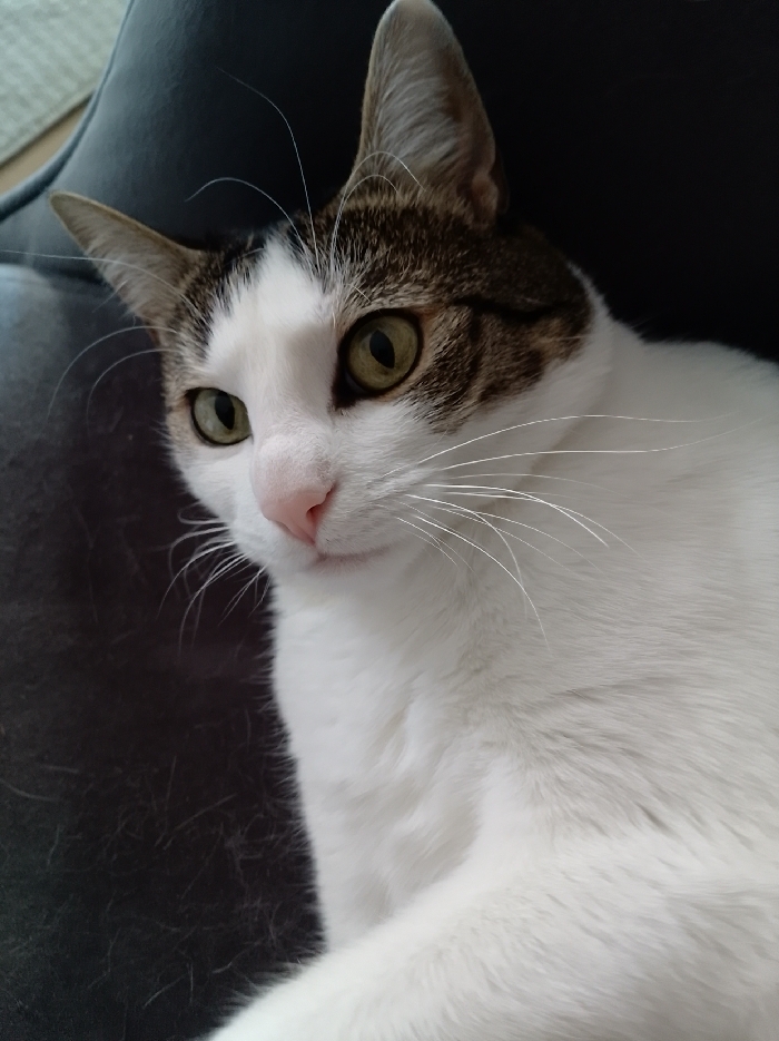 A domestic cat with white fur and prominent brown tabby markings on its head and ears is depicted in a close-up, indoor portrait. Its round, olive-green eyes are directed slightly to the left of the frame. A pink nose and numerous white whiskers are visible. The cat is positioned on a dark gray upholstered surface, consistent with a piece of furniture such as a sofa or chair. The background is out-of-focus, indicating an interior room. Location: Indoors, residential environment, city of Unknown, Unknown.