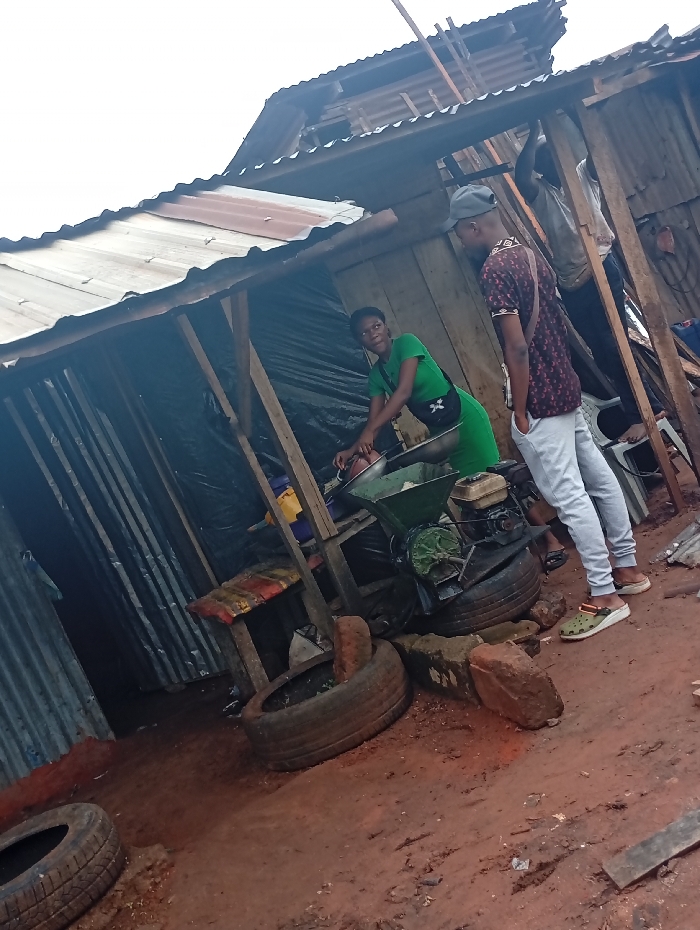 This image depicts an informal outdoor commercial or workshop area in Onitsha, Nigeria, under an overcast sky. The ground consists of reddish-brown earth with scattered debris including rocks and discarded tires. Two primary structures, constructed from corrugated metal sheets and wooden planks, form the background. The structure on the left features vertical corrugated walls and a sloped roof. The structure on the right, which is more open, utilizes wooden support beams and a partial corrugated roof. A black tarp serves as a back wall for a section of this structure. In the foreground-midground, a female individual, dressed in a bright green short-sleeved top and a black cross-body bag, is positioned behind a makeshift wooden stand. She is leaning forward, actively engaged with a light-colored basin or container on the stand. To her right, on the same stand, a green-colored machinery with a hopper and a small engine is visible, resting on a used tire. To the right of the female, a male individual stands upright, facing partially towards her. He is wearing a dark, patterned short-sleeved shirt, light grey pants, a grey baseball cap worn backward, and light-colored sneakers with green accents. His gaze is directed towards the female. In the deeper background on the right, another male individual is partially visible, standing within the wooden structure, wearing a light-colored shirt. A white plastic stool is visible near his feet. Two used car tires are present on the ground: one partially buried on the left, and another supporting the machinery. Scattered reddish-brown rocks are visible near the machinery.