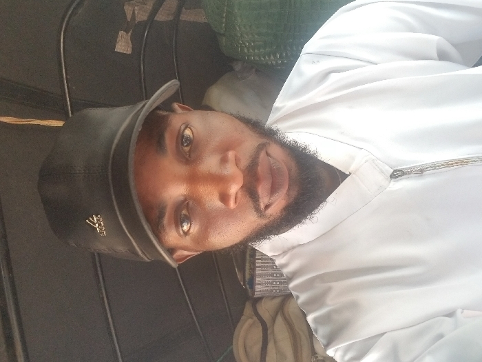 A male individual with medium-dark skin, a full beard, and a mustache is depicted in a medium shot, looking directly at the camera. He wears a black baseball cap featuring a gold-colored "Adidas" logo on the front and a white zip-up jacket with a silver-colored zipper. The background consists of a dark, enclosed interior, likely a vehicle, characterized by an overhead panel and visible structural elements. To the left, light-colored bundled items are partially visible, while a textured green object is present on the right. The scene is located in the city of Ochadam, Nigeria.