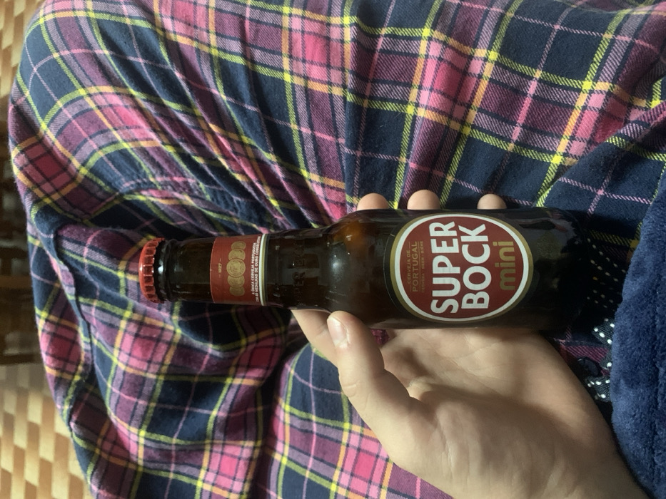 A hand holds a small, amber-colored bottle of Super Bock mini beer. The bottle has a red cap and a label with the brand name clearly visible. The person is wearing pink and blue flannel pajama pants. Part of a blue plush robe sleeve is visible on the right. The background is slightly blurred, indicating a close-up shot.