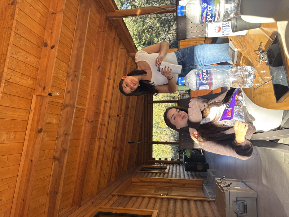 Two women sit at a table laden with water bottles, a can of beer, chips, and a tablet. One woman wears a white top and jeans, the other a brown sweater and a white shirt. The setting appears to be a wooden cabin or porch with a view of trees in the background. A small lawnmower and storage containers are visible behind them. The image has been rotated 90 degrees counterclockwise.