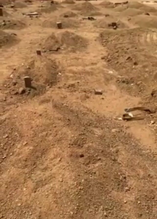 Okay, here's a detailed description of the video: The video shows a wide, open dirt area. The ground is covered in reddish-brown soil and small pebbles. The area is scattered with many small mounds of dirt, each with a brick or similar object placed on top. These mounds appear to be graves. There are also random pieces of debris scattered throughout the area, including scraps of fabric, discarded tires, and pieces of white material. In the background are several unfinished buildings. They are mostly brick structures, and appear to be in various stages of construction or abandonment. The sky is bright and clear, suggesting a sunny day. There are no people visible in the video. The camera slowly pans across the scene, providing a panoramic view of the dirt area and the buildings in the background. The overall impression is one of neglect and abandonment.
